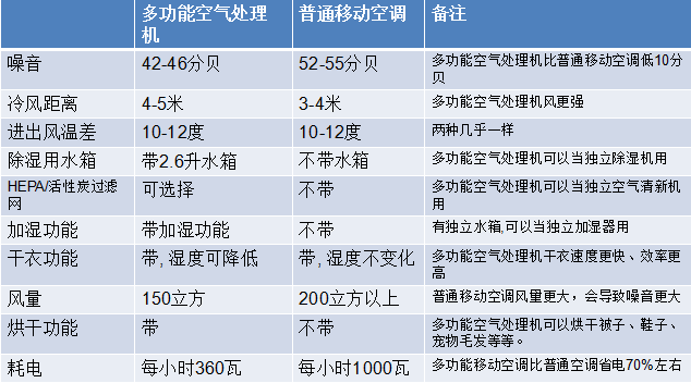 多功能空氣處理機與普通移動空調對比: