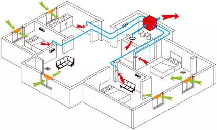 與單向流新風系統的自然強制送風相比,雙向流新風系統采用的是機械送風。雙向流新風機具有獨立的排風及送風系統,受污染的空氣經排風口、排風管道及排風機排至室外,室外的新鮮空氣則通過送風機、送風管道和送風口送入室內。