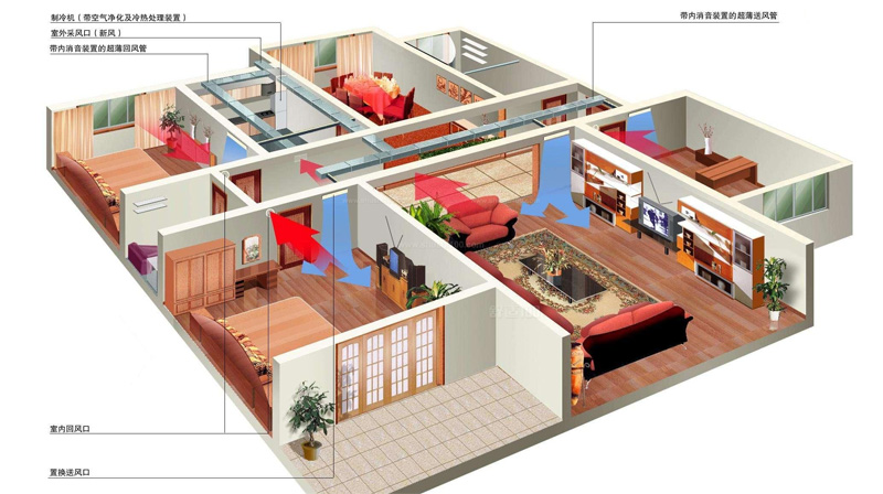 新風(fēng)系統(tǒng)能24小時源源不斷向室內(nèi)提供新鮮空氣,將室外新鮮空氣經(jīng)過處理后送入室內(nèi),通過風(fēng)口、排風(fēng)管道和風(fēng)機將室內(nèi)污濁空氣排出室內(nèi)。