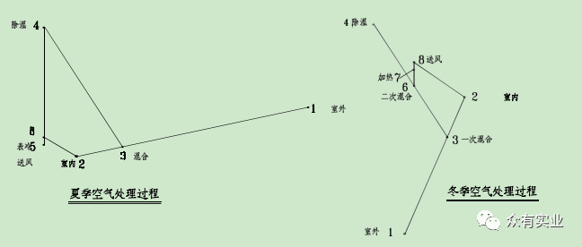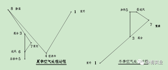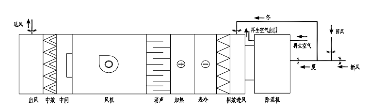 此系統(tǒng)中,夏季:溫度為 Tw 濕度為 RHw 的室外風經(jīng)與室內(nèi)風經(jīng)一次回風混合后,達到某一狀態(tài)點3,進入轉輪除濕機,其出風狀態(tài)點為 4(Rho 小于 4%,T 達到 43℃左右),然后再經(jīng)過表冷器干冷處理后達到狀態(tài)點 5,經(jīng)風機溫升達到狀態(tài)點 6 后送入室內(nèi),以保證室內(nèi)狀態(tài)參數(shù) Tn,RHn。冬季:溫度為 Tw, 濕度為 RHw 的室外風經(jīng)與室內(nèi)風經(jīng)一次回風混合后,達到某一狀態(tài)點 3,取一部分回風進入轉輪除濕機,其出風狀態(tài)點為 4(Rho 小于 4%,T 達到 43℃左右),再與未經(jīng)過除濕機的回風經(jīng)二次回風混合后達到混合點 6,然后經(jīng)蒸汽加熱器處理后達到狀態(tài)點 7,經(jīng)風機溫升達到狀態(tài)點 8 后送入室內(nèi),以保證室內(nèi)狀態(tài)參數(shù) Tn,RHn。此類系統(tǒng)可以提供 RHn=2%~30%的環(huán)境參數(shù),常用于濕度要求較高的系統(tǒng)。