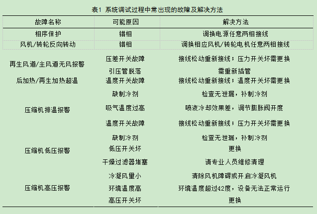 3)對壓差控制器(壓縮機吸氣低壓控制器、壓縮機排氣高壓控制器、冷凝壓力控制器)、溫度開關(噴液和排溫開關、再生與主加熱超溫開關)進行手動操作報警檢測,確保其報警點顯示與對應 PLC 或觸摸屏的上的報警狀態顯示一致。