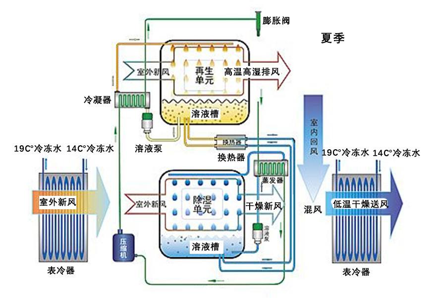 溶液除濕空調(diào)系統(tǒng)利用溶液直接處理空氣 ,在室內(nèi)風(fēng)機盤管中沒有冷凝水 ,因而避免了傳統(tǒng)空調(diào)系統(tǒng)中風(fēng)機盤管的凝水盤滋生細菌的問題。另外 , 常用的除濕鹽溶液 ,如氯化鋰、溴化鋰、氯化鈣等均具有殺滅細菌微生物等作用。已有測試表明 , 常溫下 3 mL 溴化鋰溶液能夠在 3 h 內(nèi)殺死 5 萬個XL 12blue 實驗細菌。氯化鋰溶液能殺死葡萄球菌、鏈球菌、肺炎桿菌、大腸桿菌、變形菌、綠膿桿菌、壞疽菌等 。實際系統(tǒng)中 ,病菌在鹽溶液停留的時間較長 ,為溶液的殺菌提供了條件。
