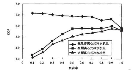 因此,雖然在不同負荷運行條件下,COP曲線呈現出衰減趨勢,但在70%的負荷范圍內,COP曲線整體呈現水平狀態,節能效果明顯優于其他兩種形式的離心冷水機組。
