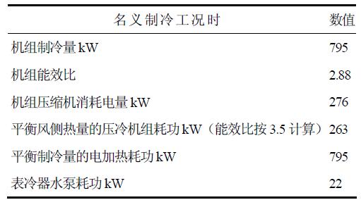 該測(cè)試系統(tǒng)在測(cè)試時(shí),運(yùn)用表冷器能夠使得冷熱量自平衡,最大限度地利用風(fēng)冷冷(熱)水機(jī)組使用側(cè)的冷量與熱源側(cè)的熱量交換,熱源側(cè)的熱量被使用側(cè)的冷量平衡后剩余的只有壓縮機(jī)的功率這部分熱量需要通過冷卻設(shè)備散去,并不需要消耗大量的能量來單獨(dú)平衡使用側(cè)產(chǎn)生的冷量和熱源側(cè)產(chǎn)生的熱量。而且風(fēng)冷冷(熱)水機(jī)組的能效比越高,同等制冷量下,需要測(cè)試系統(tǒng)散去的壓縮機(jī)功率也就越少,測(cè)試系統(tǒng)也越節(jié)能。以800kW風(fēng)冷冷(熱)水機(jī)組制冷為例,表冷器的運(yùn)用對(duì)測(cè)試系統(tǒng)的耗能比較見表1。
