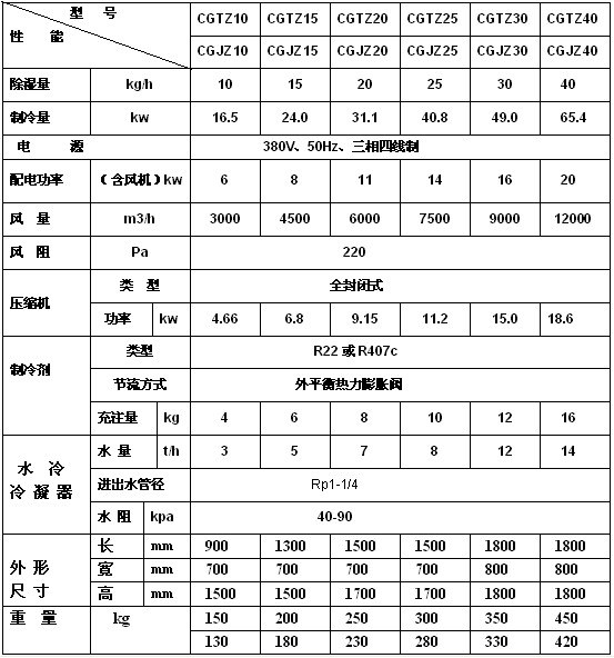 備注:A 調溫管道除濕機用字母“CGT”表示