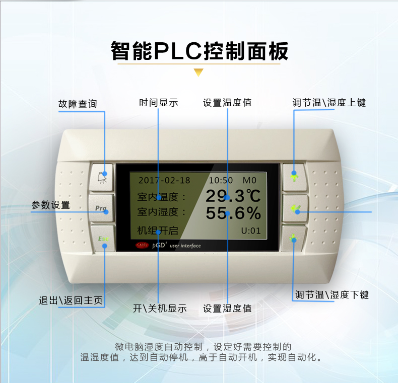 、高性能電子電極加濕器:不滋生細(xì)菌,對室內(nèi)空氣無污染;對水質(zhì)無特殊要求,無需水處理;獨立加濕器控制板,自動定時換水清洗,延長使用壽命,能自動根據(jù)加濕要求控制水位及加濕電極電流,實現(xiàn)高精度控制,真正滿足高精度要求;