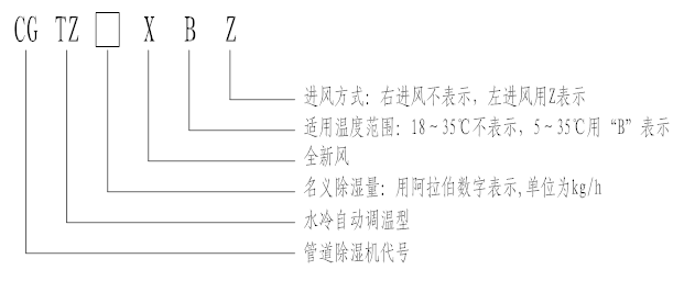 4. CGTZ150XBZ:表示名義除濕量為150kg/h,進風方式為左進風,適用溫度范圍為5℃~35℃的全新風水冷自動調溫型管道除濕機